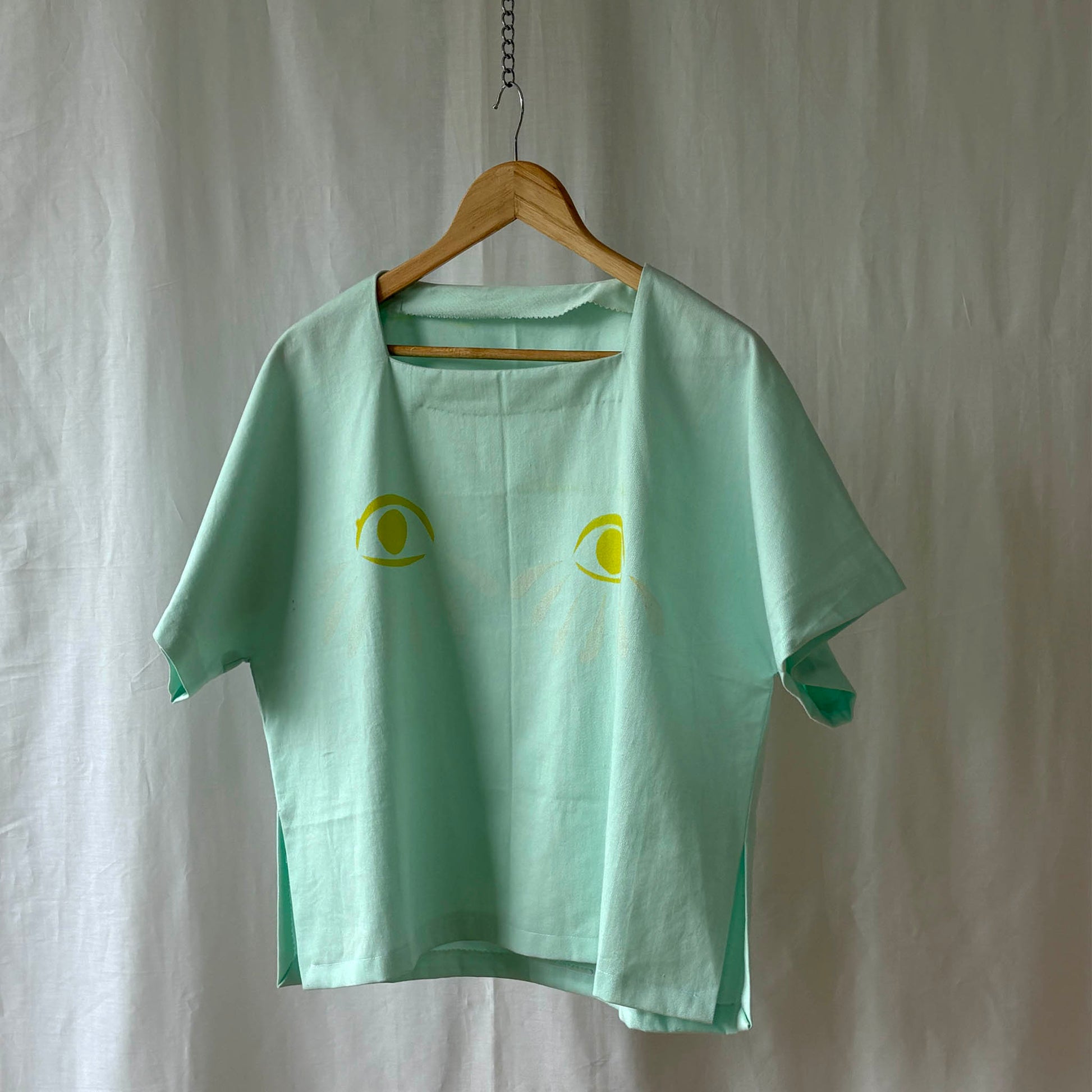 Experimental Quick Cut Tee using a woven fabric instead of a knit. Featuring the My Eyes Are Down Here daisy motif for the first time.